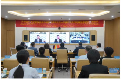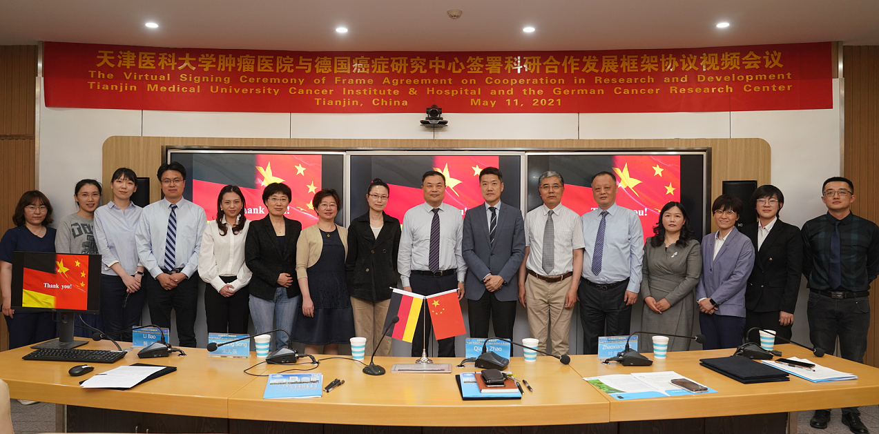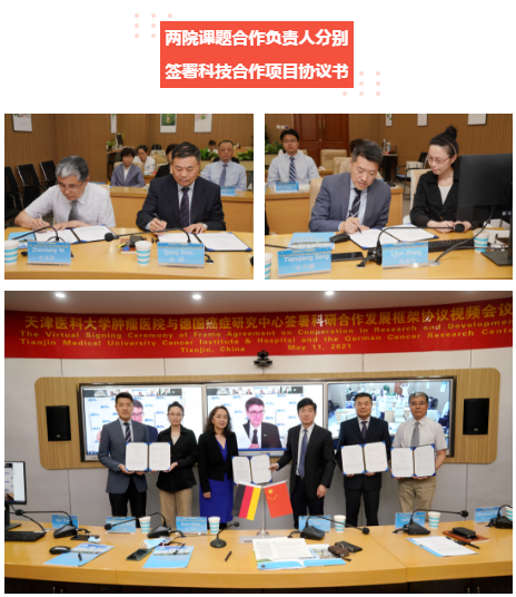 In order to promote substantial cooperation between Tianjin Medical University Cancer Institute & Hospital (TMUCIH) and the German Cancer Research Center(DKFZ), the two institutions held a Virtual Signing Ceremony of the Framework Agreement on Cooperation in Research and Development and initiated the Individual Project Agreements on May 11, 2021. This aimed to establish the bridge of "on-line academic exchange" by enabling close exchanges and interactions and giving a strong incentive to the bilateral exchanges and cooperation.
